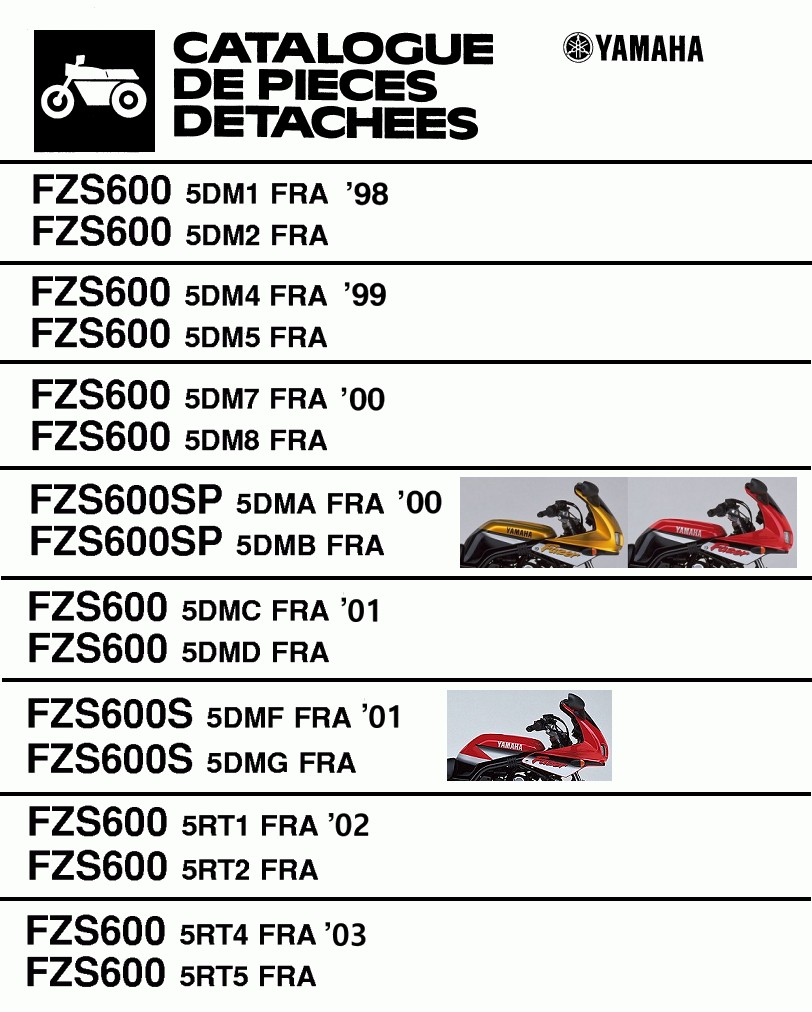 Lorsqu'une référence commence par 4YR ça veut dire qu'elle est commune FZ 400 / FZS 600, quand elle commence par 5DM ou 5RT c'est quelle a été créée pour la FZS 600. Lorqu'une pièce a une référence qui commence par autre chose comme les disques de frein 4HM, c'est que la pièce est issue d'une autre Yamaha produite avant comme la XJR 400 dans ce cas.